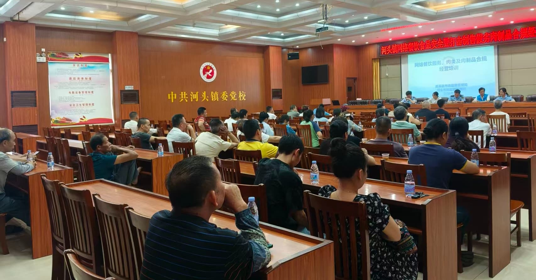 为切实落实国家关于网络餐饮食品安全治理、肉类及肉制品经营规范的民生工作要求,进一步压实市场经营主体责任,守护辖区群众“舌尖上的安全”,2026年4月22日下午,遂溪县市场监管局河头市场监管所联合河头镇政府,协同遂溪县个私协会河头个私协办事处,在河头镇政府二楼会议室成功举办专题培训会议。河头镇委纪委副书记、纪检监察办公室主任杨培翠,河头市场监管所所长李小林,执法工作人员李海龙、陈严榕,河头个私协支部书记、办事处主任赖曾出席会议。辖区内肉类及肉制品经营单位负责人、餐饮服务个体工商户代表近100人参加培训。